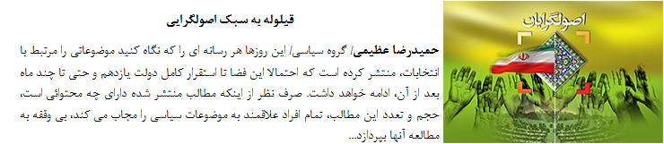 در همین زمان، در میان این مطالب به ویژه آنها که در رسانه های یک جریان خاص منتشر می شود، استراتژی ویژه ای، قابل رصد است. طیف اصولگرایان افراطی که از آنها به "جریان افراط" یاد می کنیم، هم زمان دو خط خبری را دنبال می کنند. یکی اینکه با شیوه های مختلف، ثابت کنند روحانی اصلاح طلب نیست دیگر اینکه نوع انتخابات بیست و چهارم خرداد را به عملکرد دولت محمود احمدی نژاد مرتبط سازد.